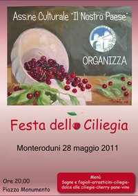 Condividi su: L'associazione "IL NOSTRO PAESE" organizza : FESTA DELLA CILIEGIA Menù: Sagne e fagioli - arrosticini - ciliegie - dolci alle ciliegie cherry - pane - vino sabato 28 maggio alle ore 20.00 Piazza Monumento Monteroduni (IS) Condividi su: