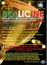 *** BOLLICINE 2010 – 5a Edizione *** Itinerario nel mondo degli spumanti italiani SPUMANTI IN DEGUSTAZIONE E ABBINAMENTI Prosecco -Terresacre ...Cuvée Brut Franciacorta (metodo classico) – Bellavista (T’rcniegl’ di Natale) Gran Cuvée Brut Franciacorta (metodo classico) – Bellavista (Quiche lorraine) Gran Cuvée Saten Brut Franciacorta (metodo classico) – Bellavista (Baccalà in pastella) Franciacorta Zero (metodo classico) - Contadi Castaldi (Carpaccio di salmone ) Vittorio Moretti Franciacorta (metodo classico) – Bellavista (Ostriche) Moscato d’Asti – Terresacre (Panettone al “Rispetto” Riserva di Montepulciano Terresacre) La quota di adesione è fissata in € 25,00 (€ 22,00 Soci Slow Food) Le prenotazioni, che si intenderanno valide dietro versamento della quota, dovranno essere effettuate entro e non oltre il 26 dicembre 2010. Per prenotazioni ed informazioni telefonare ai numeri 338 1048796 (Francesco Martino) o 339 3408524 (Gaetano Galasso) o rivolgersi a: BAR “IL CENTRALE”Corso Campano 34/36 - Venafro tel 0865 904280