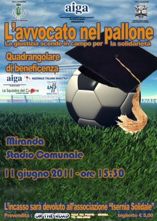 La giustizia vince con il gioco di squadra. Con questo spirito si giocherà la partita di beneficenza organizzata dalla sezione di Isernia dell’Aiga, l’Associazione italiana giovani avvocati. L’appuntamento è per sabato 11 giugno, a partire dalle 15:30, allo stadio comunale di Miranda, la cui amministrazione ha accolto con interesse l’iniziativa, conferendo anche il patrocinio alla manifestazione.