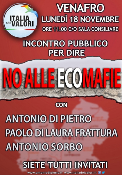 VENAFRO - Nella giornata di lunedì 18 novembre alle ore 11:00 presso la sala consiliare del Comune di Venafro si terrà una conferenza stampa dal titolo “Rifiuti tossici in Molise, no alle ecomafie” per affrontare la questione dello sversamento dei rifiuti tossici in Molise rivelati dal pentito di mafia Schiavone. L’incontro, organizzato su impulso del nuovo coordinamento regionale dell’Italia dei Valori, sarà aperto al pubblico e vedrà la partecipazione del presidente onorario dell’IdV, on. Antonio Di Pietro, del presidente della Giunta Regionale Paolo Di Laura Frattura e del sindaco del Comune di Venafro Antonio Sorbo il quale ha inteso ringraziare all’on. Di Pietro per la sua presenza sul territorio e per l’attenzione che, ancora una volta, dimostra di voler dedicare a tematiche importanti legate all’ambiente e alla salute pubblica.