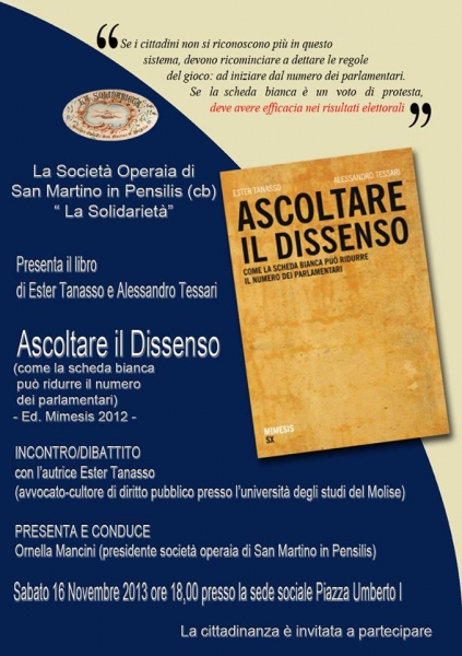 Parte da questa riflessione "Ascoltare il dissenso, come la scheda bianca può ridurre il numero dei parlamentari", il libro scritto da Ester Tanasso e da Alessandro Tessari che sarà presentato domani, sabato 16 novembre, a San Martino in Pensilis.
