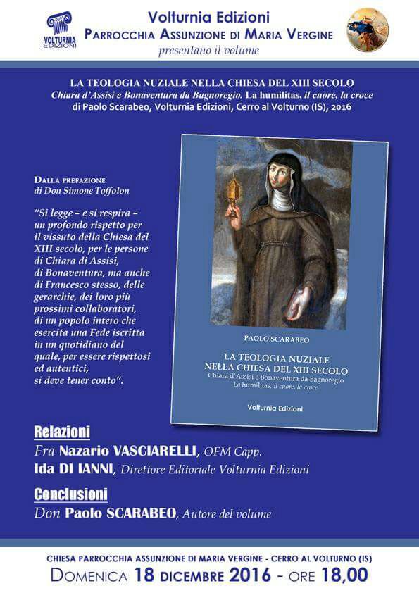In ultimo segnaliamo per domani, alle ore 18.00 presso la parrocchia Assunzione di Maria Vergine di Cerro a Volturno, la presentazione del volume del collega sacerdote don Paolo Scarabeo: “La teologia nuziale nella Chiesa nel XIII secolo”, Volturnia edizioni. Per l’occasione saranno presenti la direttrice editoriale della Volturnia Ida Di Ianni, il frate cappuccino Fra Naziario Vasciarelli ed appunto il nostro collega don Paolo Scarabeo.