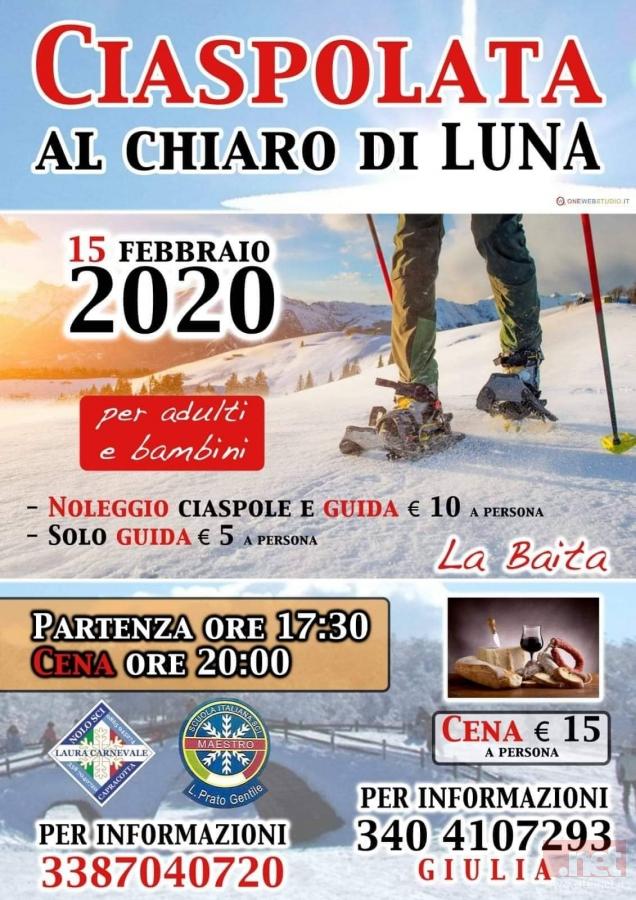 Con il ritorno della neve in alta quota torna il turismo di qualità . Per questo motivo sabato 15 febbraio a Prato Gentile arriva la ciaspolata al Chiar di Luna con cena alla Baita Prato Gentile. La partenza è prevista per le 17.30 mentre la cena alle 20.