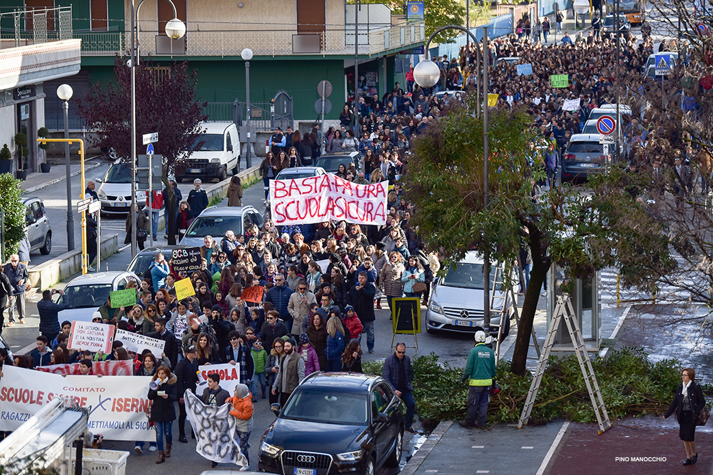 Questa mattina, a Isernia, migliaia le persone, tra studenti, docenti, genitori e cittadini che hanno preso parte alla manifestazione promossa dal Comitato “Scuole Sicure per Isernia” per chiedere, a gran voce, il rispetto e la garanzia della sicurezza delle scuole. Partito alle 9 dall’Istituto “Fermi” del capoluogo pentro, il corteo si è snodato lungo le principali strade cittadine facendo tappa dinanzi agli istituti scolastici A RISCHIO per terminare in Piazza della Repubblica a suon “La scuola non sicura è la nostra sepoltura”. Presenti il Sindaco Giacomo D’Apollonio, il Presidente della Provincia Lorenzo Coia e diversi esponenti delle amministrazioni comunali e provinciali per ribadire la necessita’di rendere sicure le scuole e rassicurare le famiglie, gli studenti, insegnanti e operatori, su quanto si puo’ fare prima dell’apertura della nuova scuola di San Leucio i cui lavori devono subire una forte accellerazione. Coia” Io ho le carte in regola nel senso che la programmazione dell’adeguamento sismico dei nostri istituti e’stato fatto in tempo debito e ad una cadenza temporale che ci garantisce oggi di conservare la popolazione scolastica nei 4 istituti che sono l’ITIS, il Liceo Manuppella, Liceo Scientifico Maiorana, e il Fermi che ci mette in una discreta vulnerabilita”. Il primo cittadino, invece, conferma una “riunione del tavolo tecnico per verificare lo stato cantieristico e per porre in essere ulteriori procedure per accelerare l’ultimazione delle opere del progetto”. Per quanto riguarda le strutture di gestione della Provincia, la stessa, e’pronta a chiudere le scuole non sicure e pensare di gestire la situazione con trasferimenti e doppi turni, per il Comune, che sfila con la cittadinanza a dimostrazione che c’e’e che intende risolvere il problema, la soluzione sta nel realizzare subito scuole nuove e sicure , una richiesta forte del diritto a un’edilizia scolastica e la richiesta di fondi, 9,7 milioni di euro, alla Regione e al Governo, per realizzare nuovi plessi scolastici sicuri. Il Sindaco ha anche reso pubbliche tutte le iniziative prese nelle ultime settimane per affrontare la questione infanzia, primaria e secondaria di I grado, in un comunicato pubblicato sul sito del Comune di Isernia in materia di sicurezza degli edifici scolastici. In sintesi: